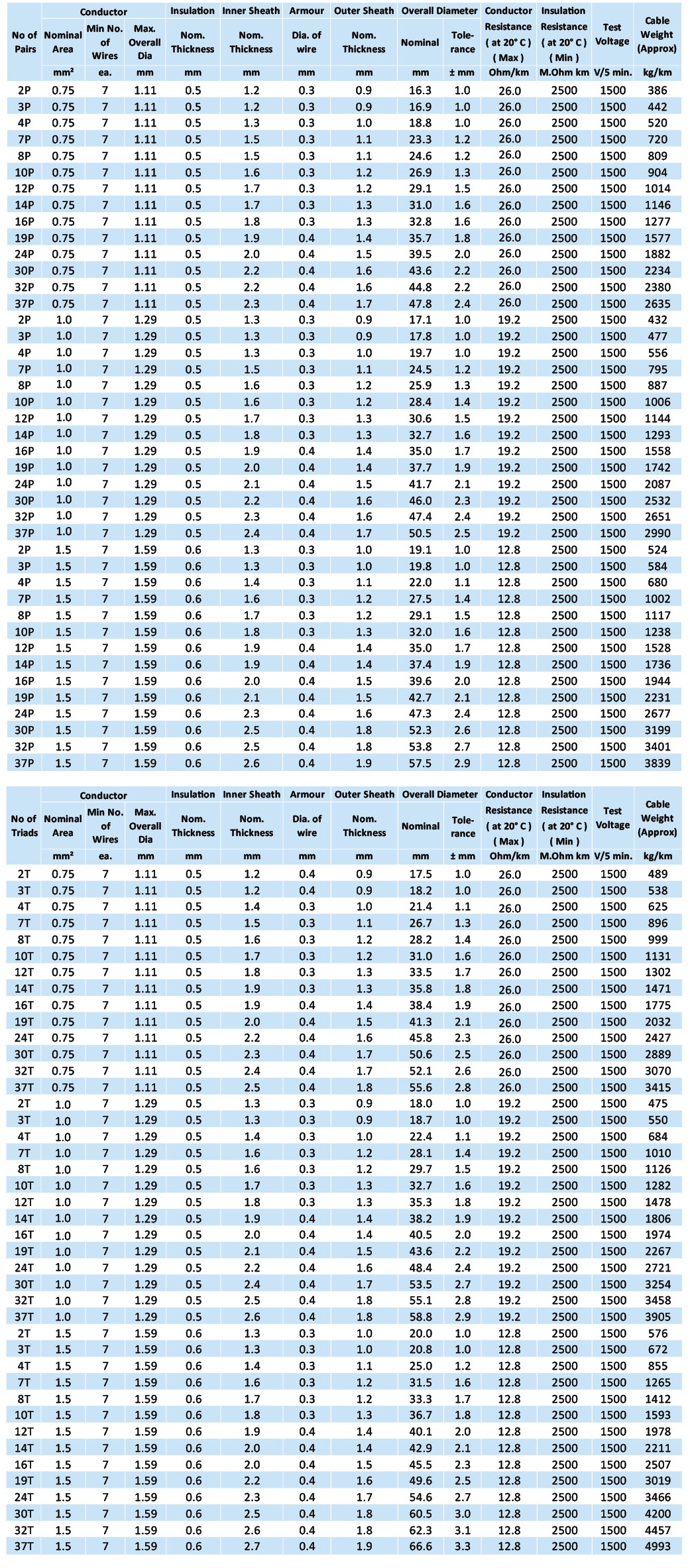 | 11. | Core identification | Colored insulation plus Arabic number printing on the insulation Pair : White, Black Triad : White, Red, Black |
