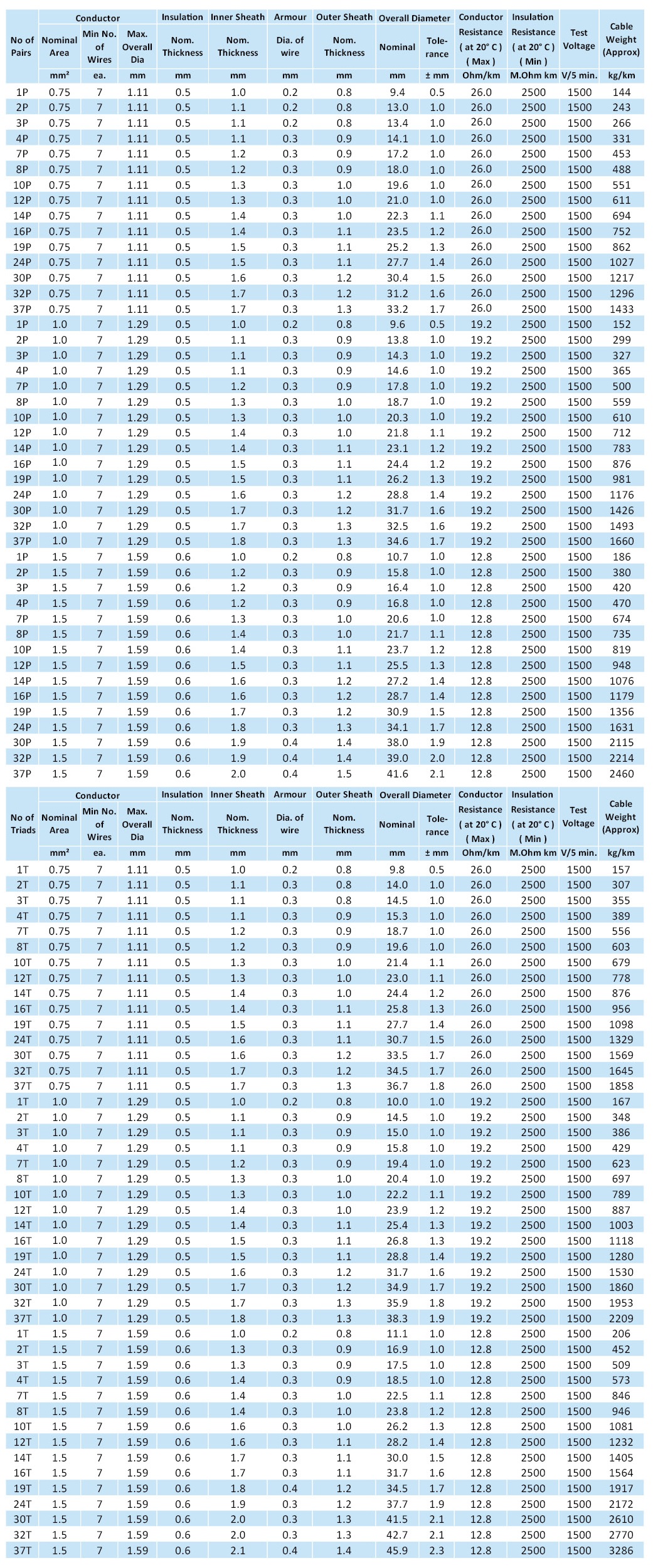 | 4. | Cabling | Twisted pairs/triads shall be cabled Flame retardant & non-hygrocopic fillers may be used Suitable tape(s) may be applied on the cabled core |