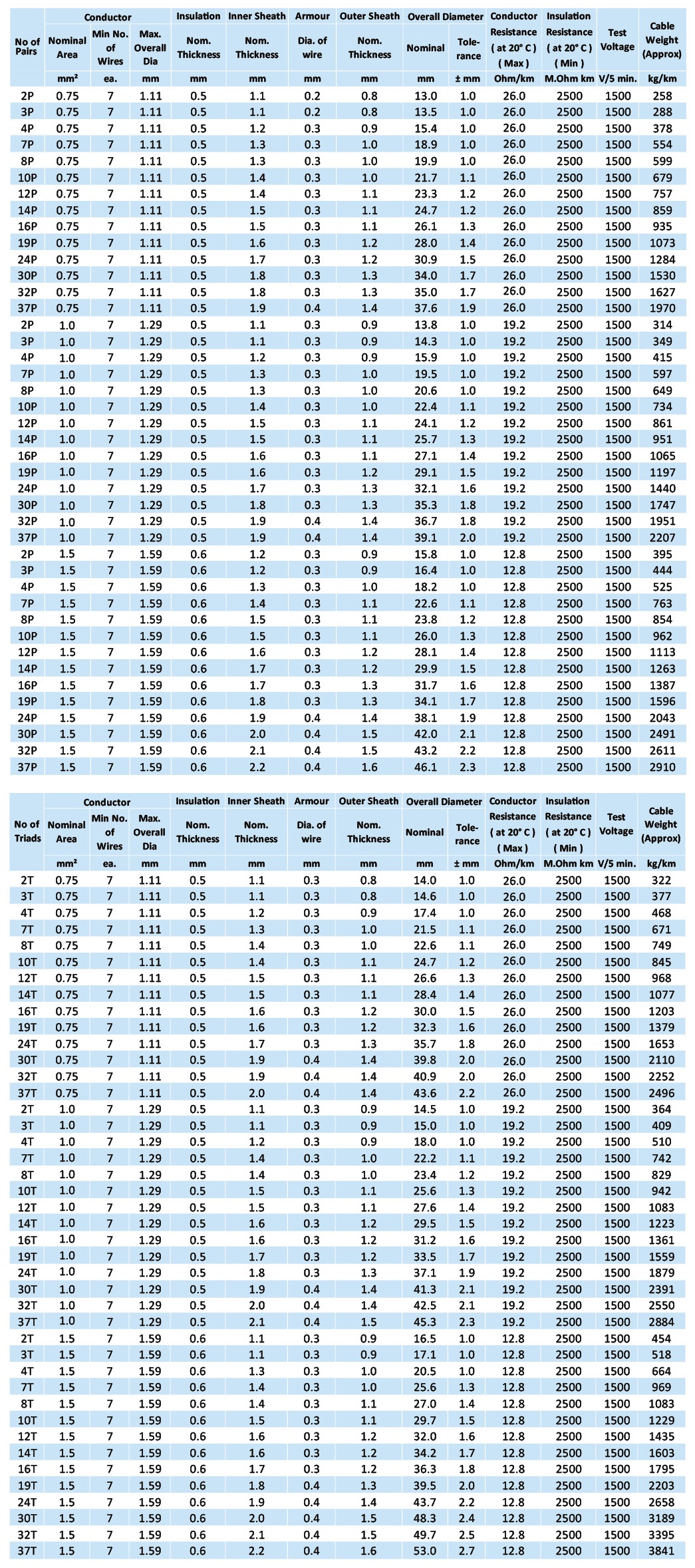 | 5. | Cabling | Twisted pairs/triads shall be cabled Flame retardant & non-hygrocopic fillers may be used Suitable tape(s) may be applied on the cabled core |