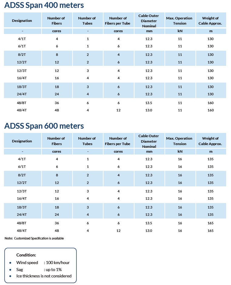 Single Mode Fiber G.652D, ADSS Span 400 m
